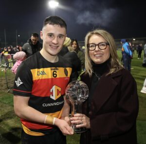 Abbey CBS Newry captain Diarmuid OβRourke presented with the man of the match trophy by Bernie Kerr from Danske Bank